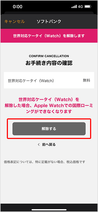 世界対応ケータイ(Watch)を「解除する」をタップ